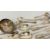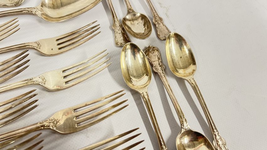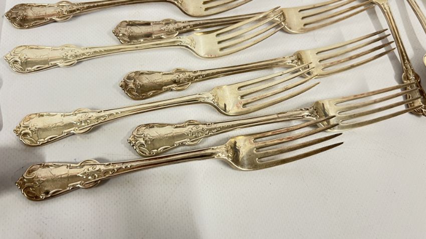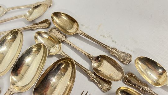 A GROUP OF GOOD QUALITY SILVER FLATWARE "TUDOR" PATTERN AS FOLLOWS...... LARGE LADLE LONDON 1862, MAKER G. ADAMS, SAUCE LADLE, SALT SPOON, 12 X FORKS LONDON 1862, MAKER G. ADAMS + ONE OTHER MATCHED EXAMPLE, 9 X TEASPOONS LONDON 1862, MAKER G. ADAMS + 3 FURTHER MATCHED EXAMPLES, 5 X LARGE SPOONS LONDON 1862 G. ADAMS + ONE OTHER MATCHED EXAMPLE + A SET OF 6 X FISH KNIVES, PLATED BLADES & WHITE METAL HANDLES (NO VISIBLE MARKS) + A SET OF 6 FORKS, PLATED FORK AND WHITE METAL HANDLES (NO VISIBLE MARKS).