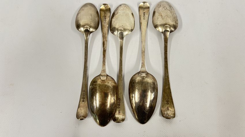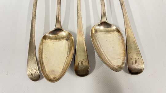 A SET OF 4 ANTIQUE SILVER SPOONS - L 22.5CM, LONDON 1801, MAKER RC + ONE OTHER.