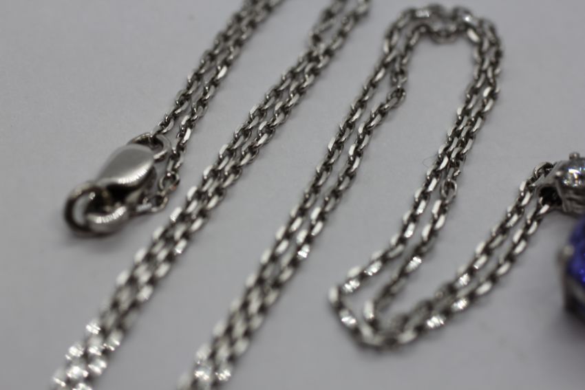 A TANZANITE AND DIAMOND PENDANT NECKLACE, THE PEAR SHAPE TANZANITE WITH BRILLIANT CUT DIAMOND ABOVE IN AN 18CT WHITE GOLD MOUNT STRUNG FROM AN 18CT WHITE GOLD NECKLACE.