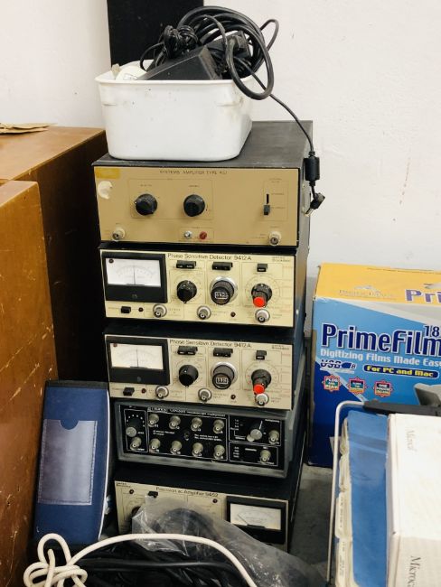 EXTENSIVE COLLECTION OF ELECTRONIC TESTING EQUIPMENT TO INCLUDE ORTEC BROOKDEAL PHASE SENSITIVE DETECTORS, FARNELL POWER SUPPLY, TEKTRONIX 2236 OSCILLOSCOPE, VICKERS INSTRUMENTS MICROSCOPE WITH ACCESSORIES, ETC. STRICTLY COLLECTORS ITEMS ONLY.
