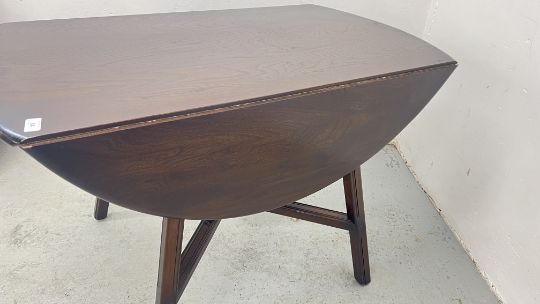 ERCOL DROP LEAF DINING TABLE WITH CROSS SECTION SUPPORTS.