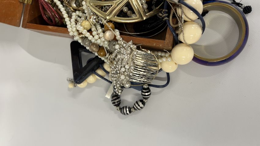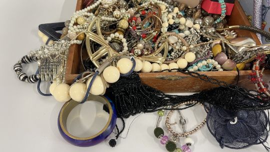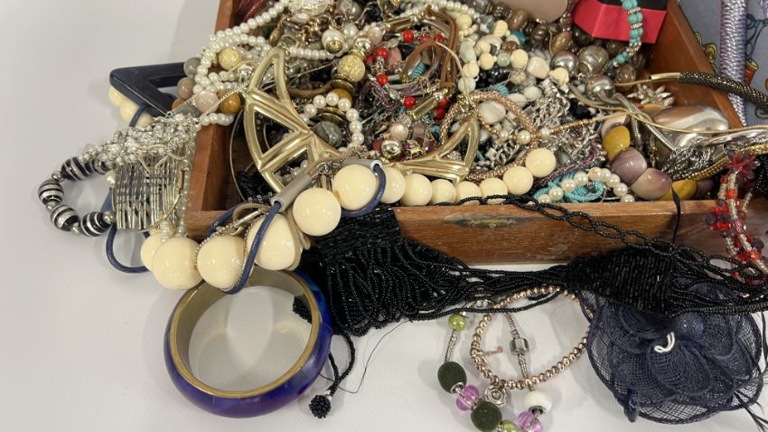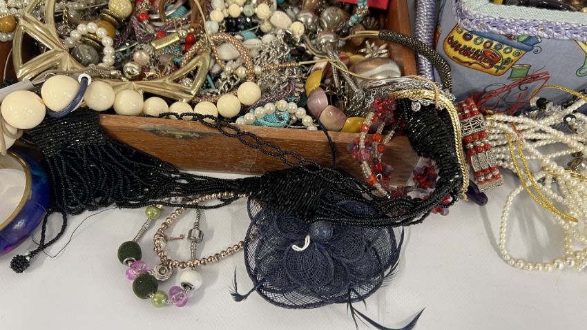 THREE BOXES CONTAINING AN EXTENSIVE GROUP OF ASSORTED COSTUME JEWELLERY, BEADED NECKLACES AND BRACELETS ETC.