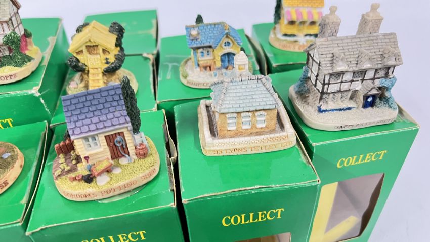 A COLLECTION OF TETLEY TEAFOLK COLLECTORS HOUSES TO INCLUDE 11 BOXED EXAMPLES + A FURTHER TWO UNBOXED + A BESWICK SWAN STUDY.