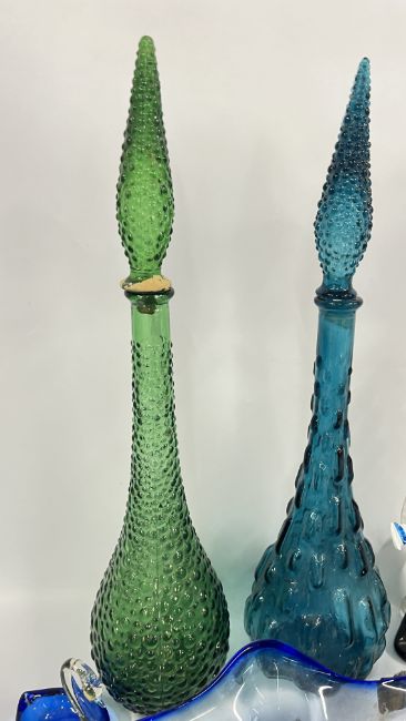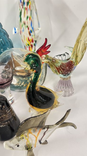 A GROUP OF ART GLASS TO INCLUDE DECANTERS AND PAPERWEIGHT, MURANO GLASS CLOWN RETAINING ORIGINAL LABEL A/F ETC.