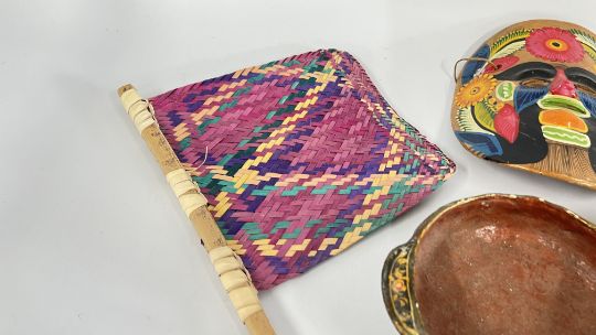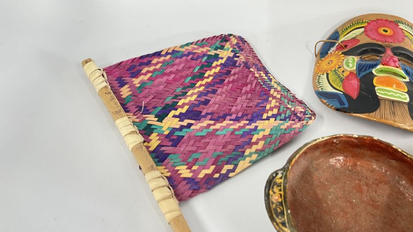 A COLLECTION OF ETHNIC ITEMS TO INCLUDE MASKS, CARVINGS, PAPERMACHE BOWLS ETC.