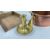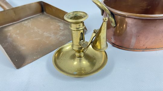 A BOX OF METAL WARE ITEMS TO INCLUDE COPPER COOKING DISH WITH BRASS HANDLES, CANDLESTICK HOLDER PLUS TWO VINTAGE WOODEN BOXES ONE INLAID WITH MOTHER OF PEARL DETAIL, ETC.