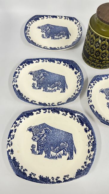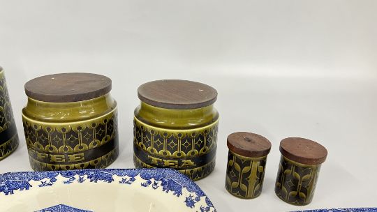 4 X VINTAGE "HORNSEA" HEIRLOOM STORAGE JARS ALONG WITH A MATCHING SALT AND PEPPER + A SET OF 6 ENGLISH IRONSTONE PLATES - SUGAR JAR HAS A HAIRLINE CRACK.