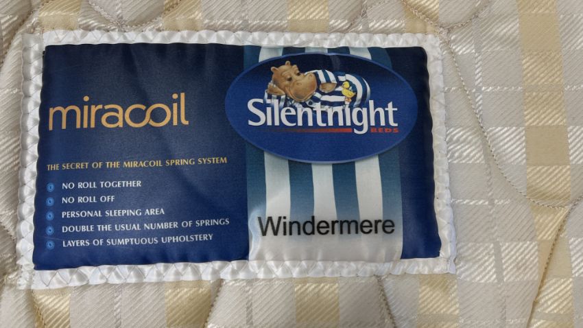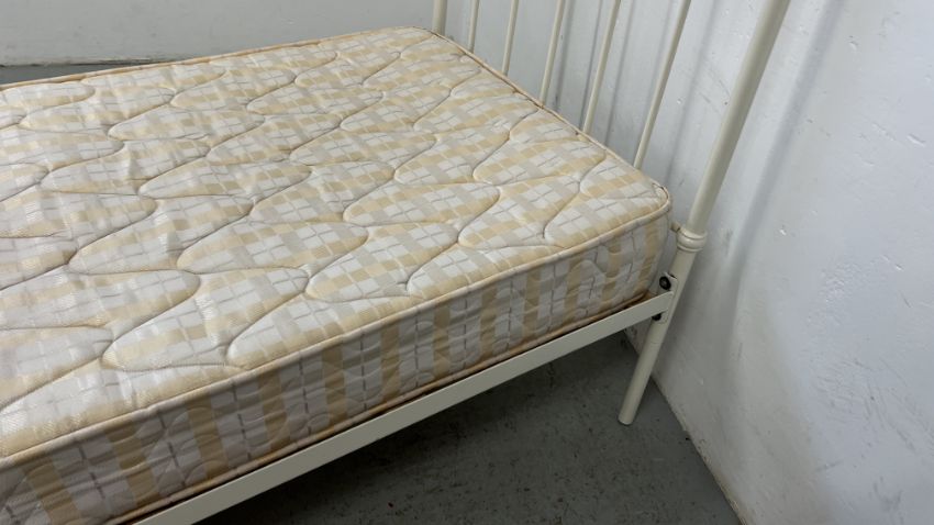 A MODERN CREAM FINISHED METAL FRAMED SINGLE BED ALONG WITH SILENTNIGHT MIRACOIL MATTRESS.