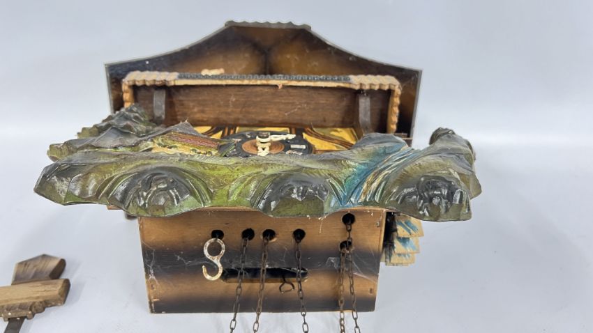 A GERMAN CUCKOO CLOCK AND WEIGHTS.
