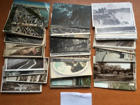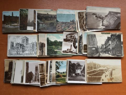 POSTCARDS: BOX WITH MIXED LOOSE CARDS, YORKSHIRE, SHELL ADVERT c1970's REPROS, EMPTY ALBUMS,