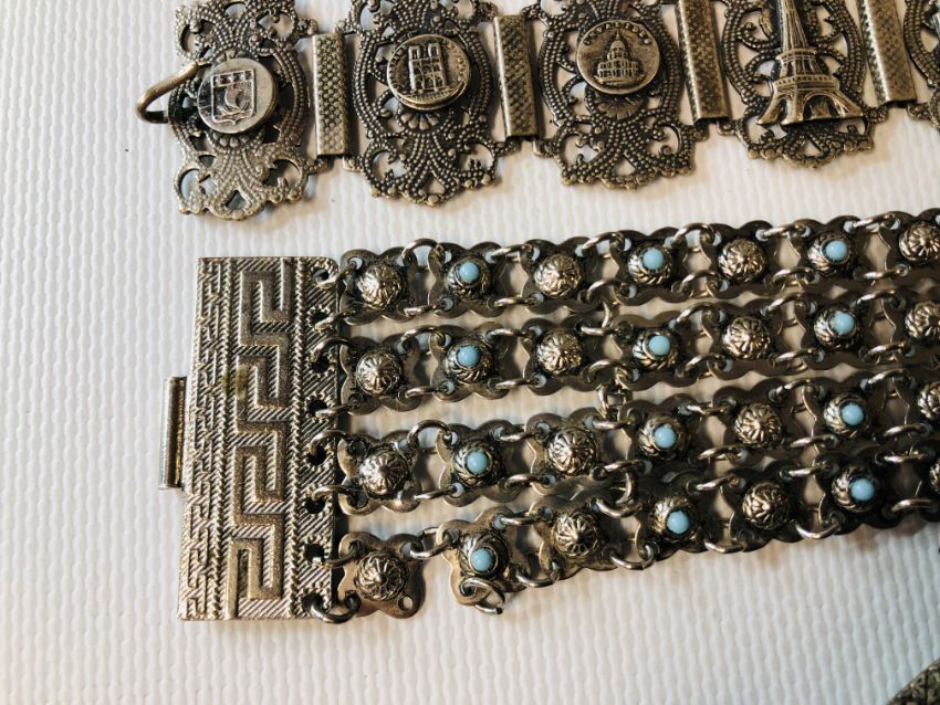 TWO WHITE METAL BRACELETS TO INCLUDE SOUVENIR BRACELET, HARDSTONE PENDANT + A PAIR OF WHITE METAL CLIP ON EARRINGS WITH APPLIED DRAGON DETAIL.