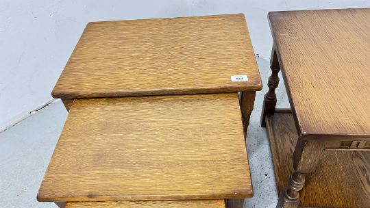 NEST OF THREE GRADUATED OAK FINISH OCCASIONAL TABLES AND OAK FINISH TWO TIER LAMP TABLE.