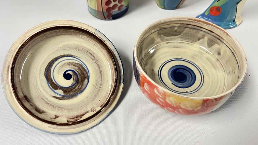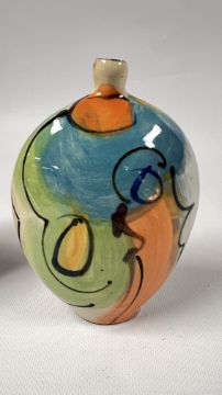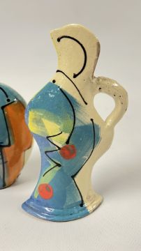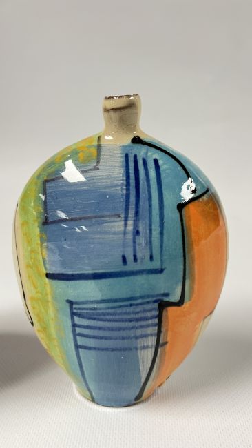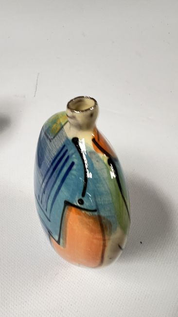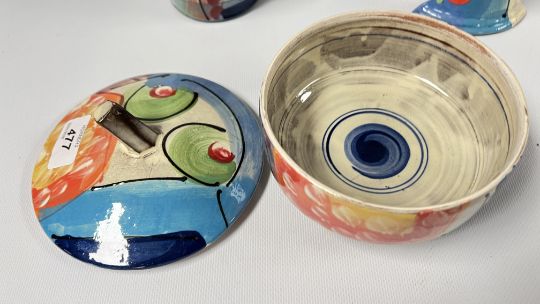 A COLLECTION OF RICHARD WILSON ABSTRACT STUDIO POTTERY TO INCLUDE FLAT BOTTLE HEIGHT 15CM, LARGE LIDDED TRINKET BOWL, ELONGATED FLAT PITCHER 18CM AND A VASE WITH A CINCHED NECK, HEIGHT 14.4CM.