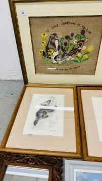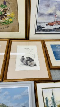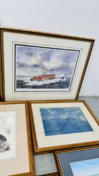 A GROUP OF FRAMED PICTURES, PRINTS AND TAPESTRIES TO INCLUDE COASTAL SCENES, SIGNED PRINTS, WATERCOLOURS ETC., APPROX 10.