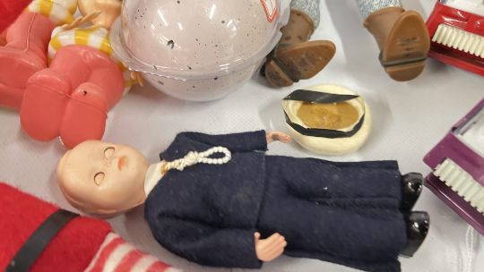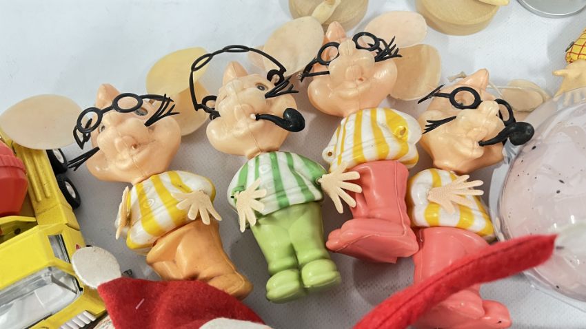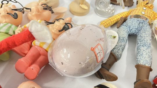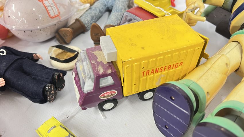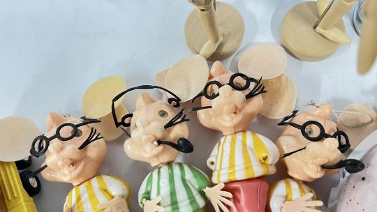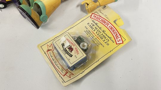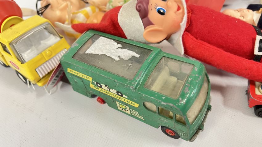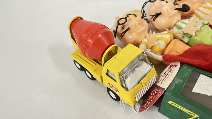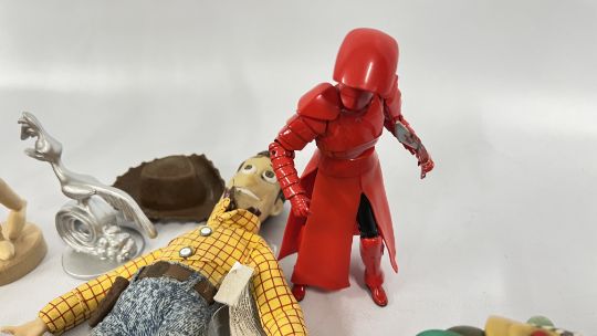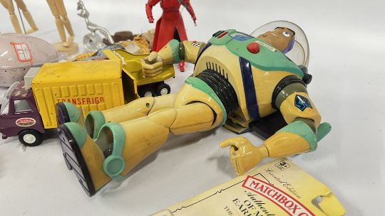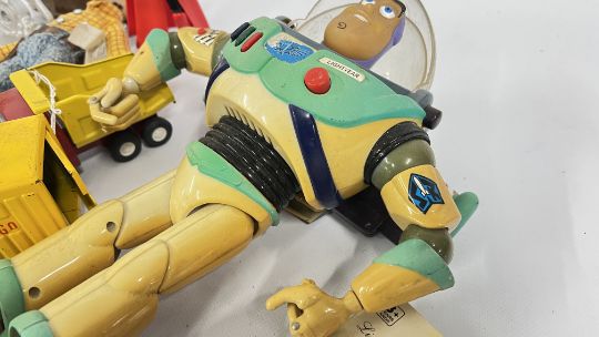A BASKET OF TOYS TO INCLUDE DIE-CAST VEHICLES, BUZZ LIGHTYEAR AND TOY STORY WOODY, TONKA AND 4 VINTAGE 1960's TOPO GIGIO FIGURES, ETC.