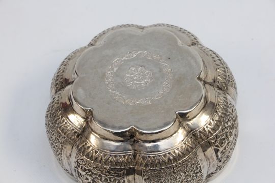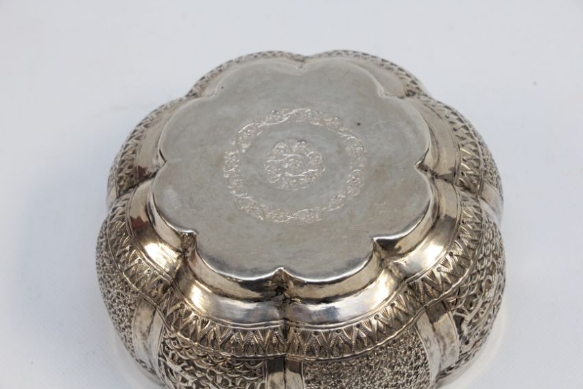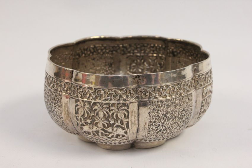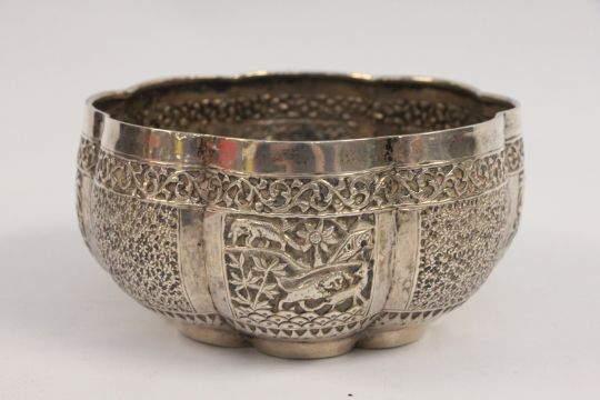 A VINTAGE CONTINENTAL WHITE METAL BOWL WITH REPOUSSE DECORATION, DIAM 17CM H 9CM.
