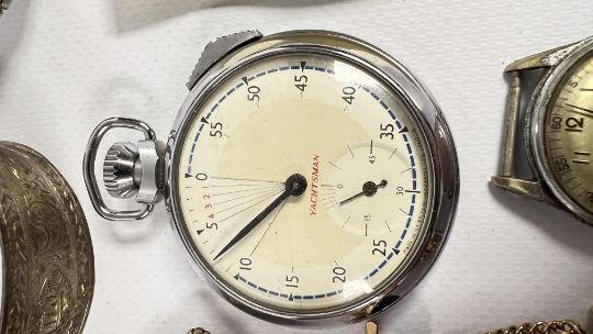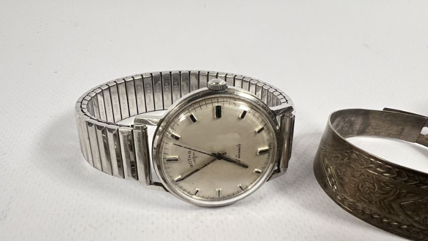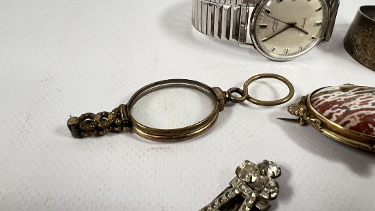 A GROUP OF VINTAGE JEWELLERY AND WATCHES TO INCLUDE A SKULL STICK PIN, WHITE METAL BANGLE, SEIKO AND ROTARY WRIST WATCHES + AN ORNATE VINTAGE BROOCH WITH A POLISHED, VINTAGE FOLDING LORGNETTE ETC..