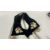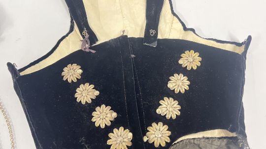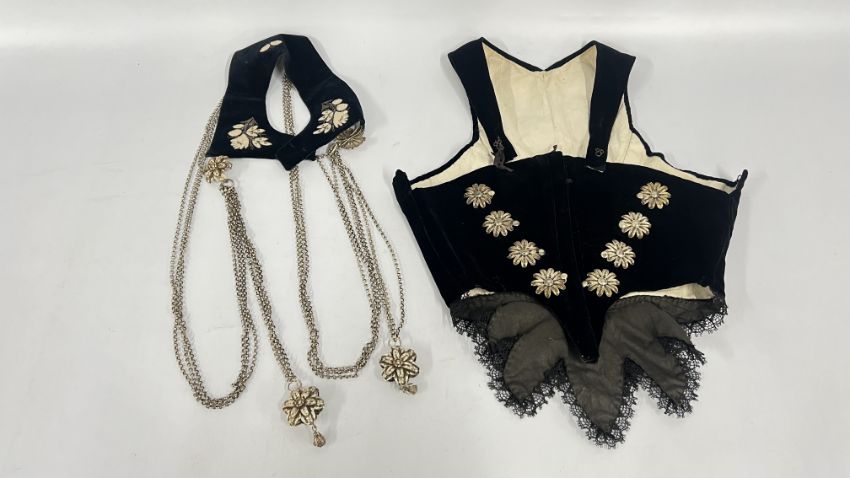 A VINTAGE BLACK VELVET CORSET AND COLLAR WITH WHITE METAL DECORATIVE CHAINS AND FILIGREE CLASPS.
