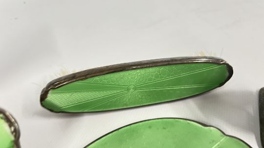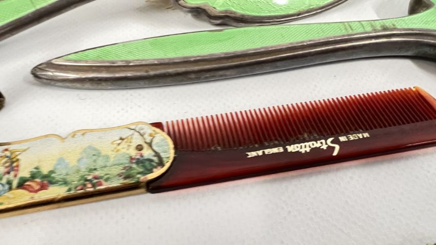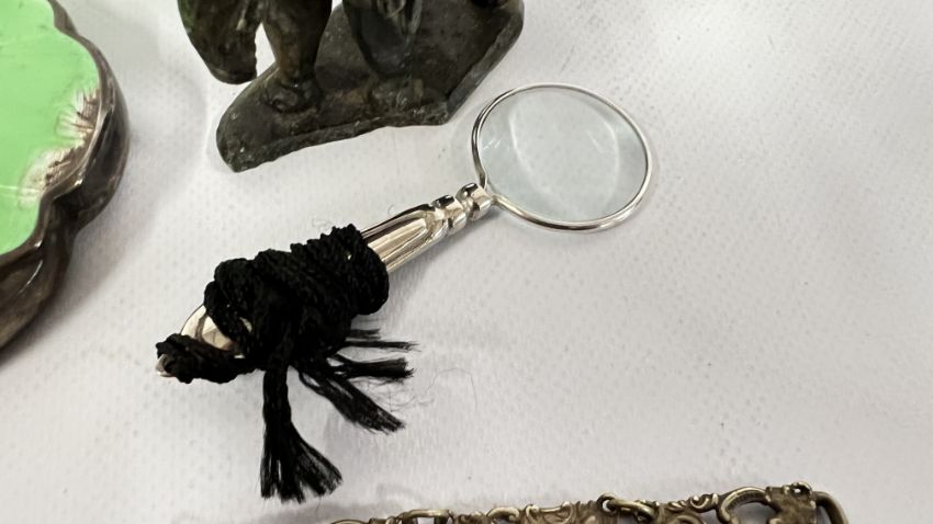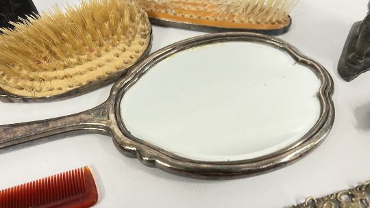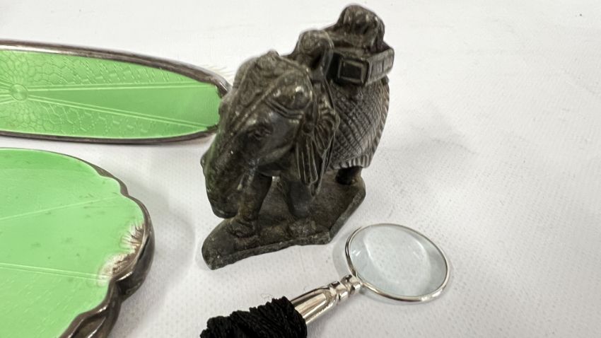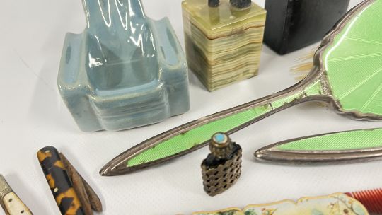 A TRAY OF ASSORTED COLLECTIBLES TO INCLUDE AN ENAMEL BRUSH SET, PEN KNIVES, MAGNIFYING GLASS, SCENT BOTTLE ETC.