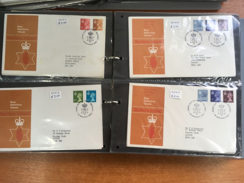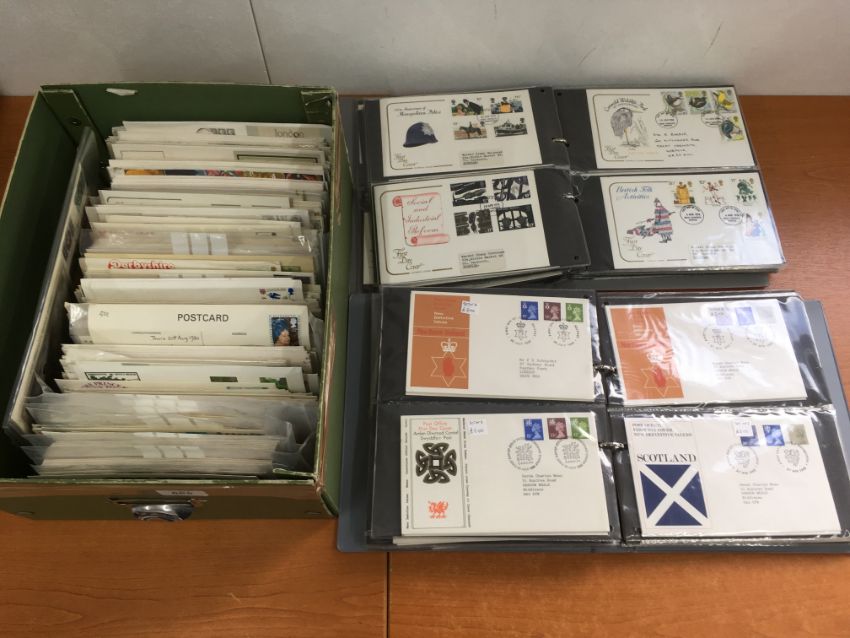 STAMPS: BOX WITH FIRST DAY AND OTHER COVERS IN TWO ALBUMS AND LOOSE.