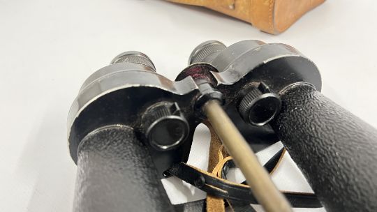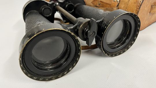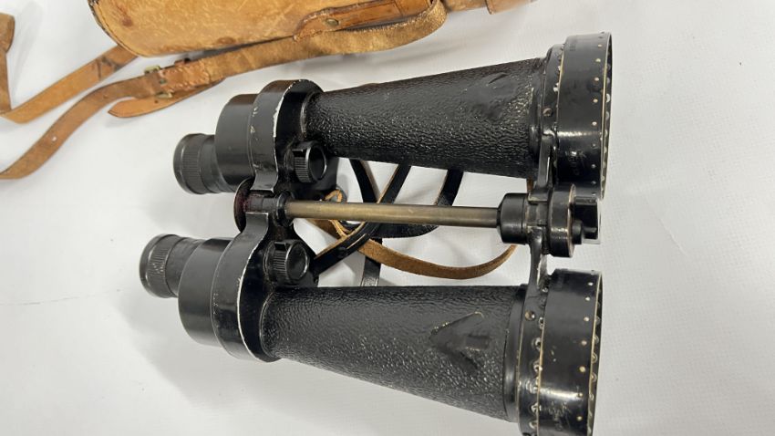 A PAIR OF VINTAGE MILITARY BINOCULARS MARKED "BARR & STROUD" GLASGOW AND LONDON 7X CF41 SERIAL NO. 42478M IN FITTED LEATHER CASE (REQUIRES ATTENTION).