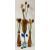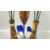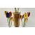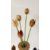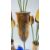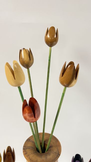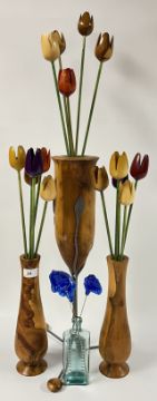 A PAIR OF MODERN TURNED YEW WOOD FLOWER VASES AND CENTRAL YEW WOOD TURNED VASE IN METAL WORK STAND, EACH CONTAINING WOODEN TULIP FLOWERS.
