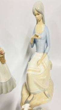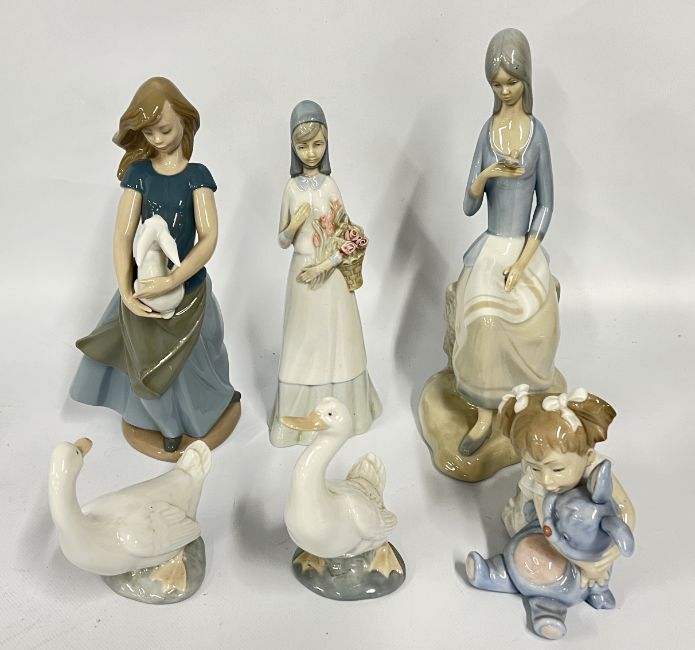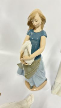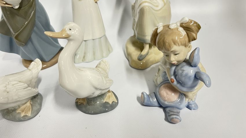 A GROUP OF FIGURINES TO INCLUDE LLADRO AND VALENCIA EXAMPLES + 2 NAO GEESE STUDIES.