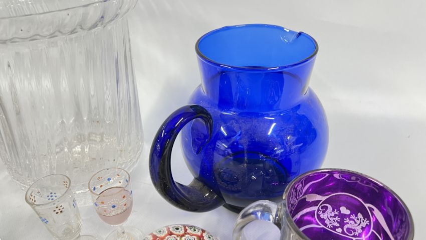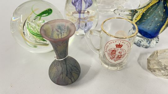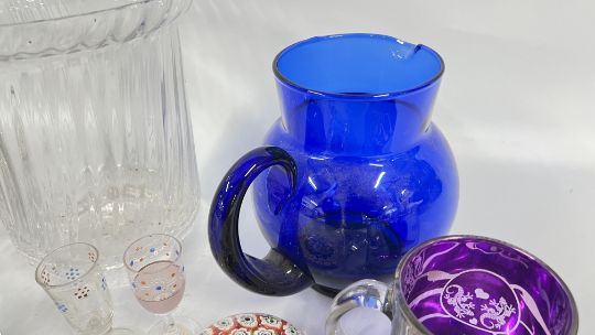 A GROUP OF GLASS WARE TO INCLUDE DARTINGTON CRYSTAL VASES, BLUE GLASS JUG, PAPERWEIGHTS TO INCLUDE AN ITALIAN EXAMPLE + SMALL GROUP OF MARBLES, ETC.