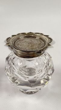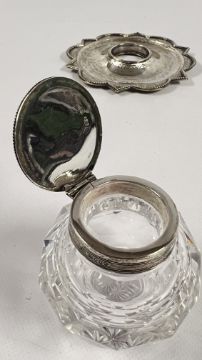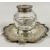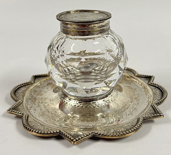 AN ANTIQUE SILVER MOUNTED HEAVY GLASS INKWELL AND STAND, LONDON 1862, MAKER R.H BEARING PRESENTATION INSCRIPTION.