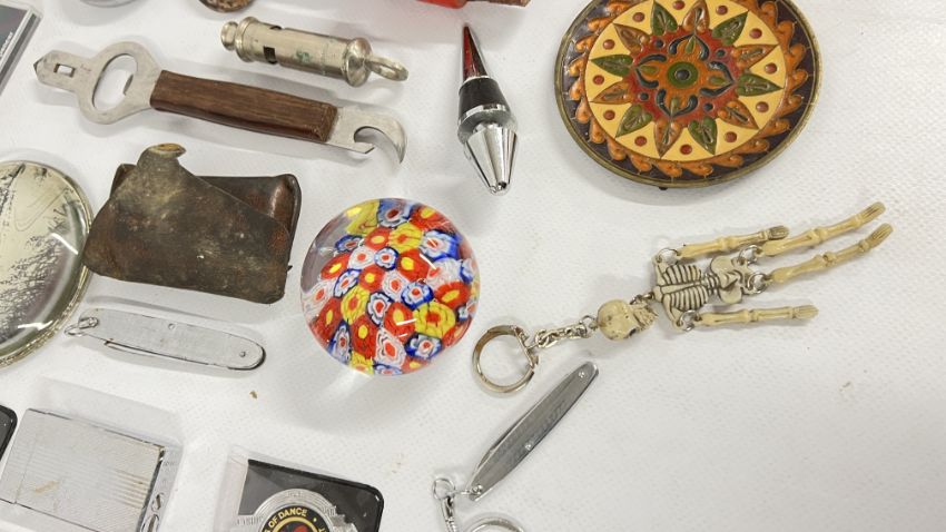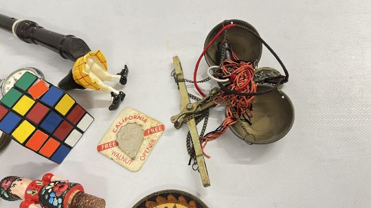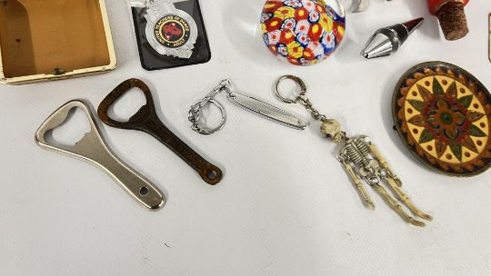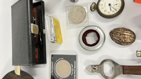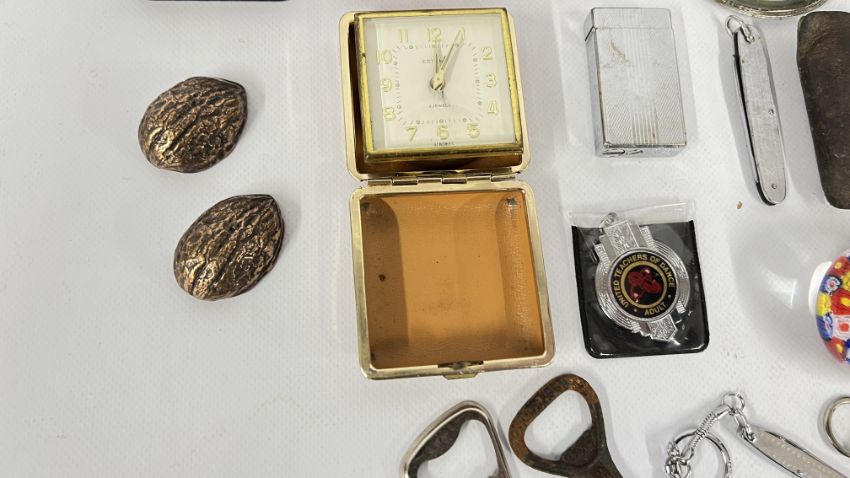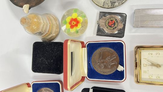 A TRAY OF COLLECTIBLES TO INCLUDE A WHITE METAL AND COPPER AZTEC ASHTRAY, LIGHTER WHISTLE, MEDALLIONS ETC.