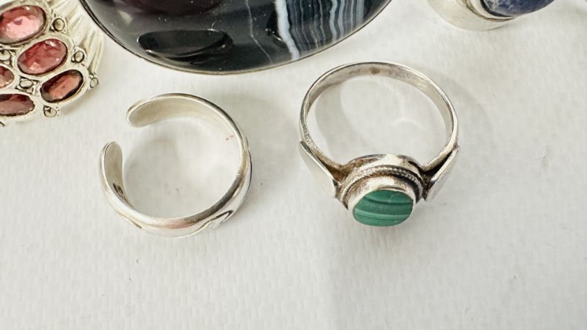 A GROUP OF 7 ASSORTED SILVER STONE SET DRESS RINGS.