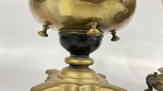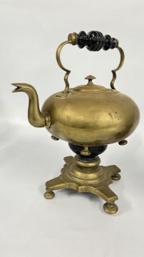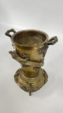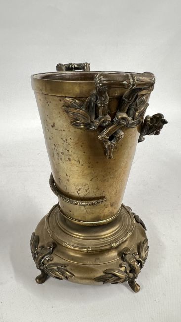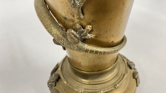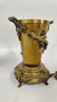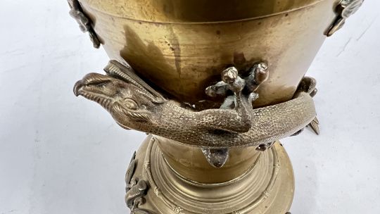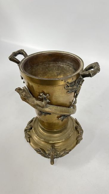 A VINTAGE BRASS KETTLE AND STAND + A VINTAGE ORIENTAL BRASS TWO HANDLED URN DEPICTING A RELIEF LIZARD ENCIRCLING THE BODY, H 27.5CM.