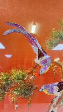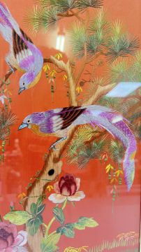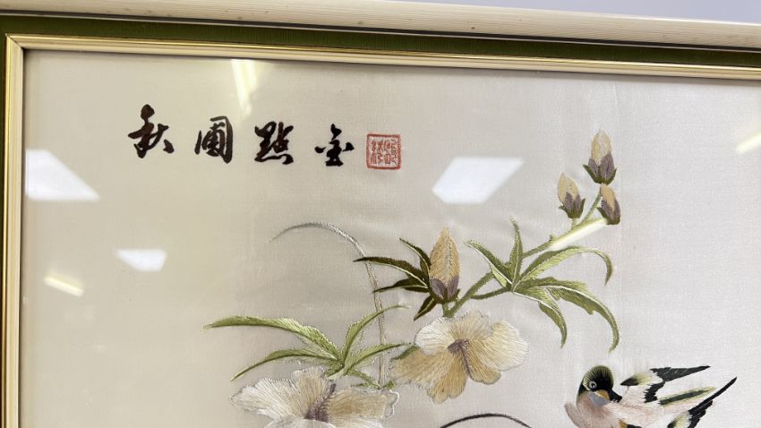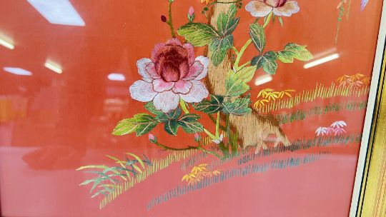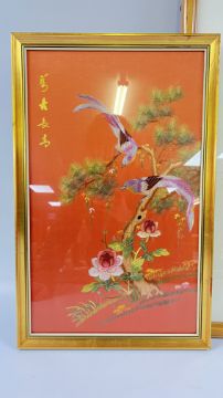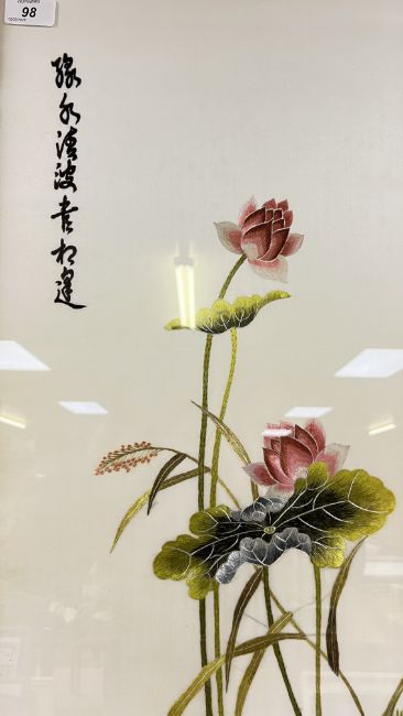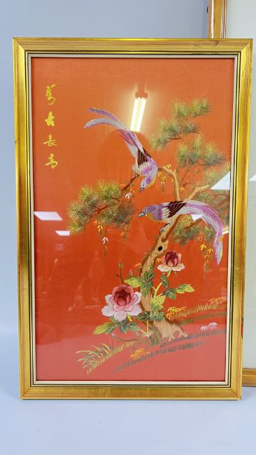THREE FRAMED ORIENTAL SILK NEEDLE WORK PANELS (THE LARGEST W 36 X H 1 METRE).