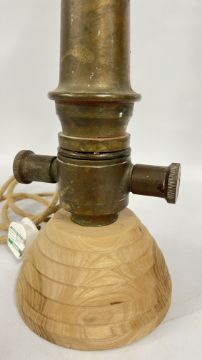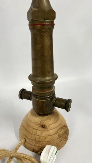 A MODERN DESIGNER LAMP BASE FASHIONED FROM A VINTAGE FIRE HOSE NOZZEL - SOLD AS SEEN.