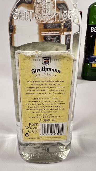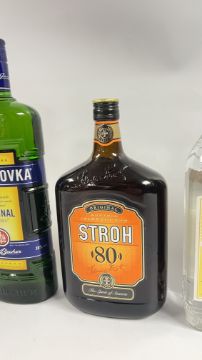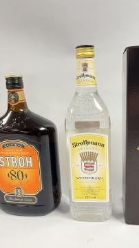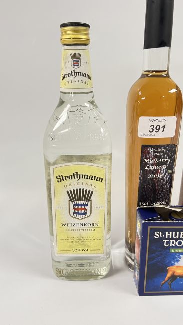 A 1 LITRE BOTTLE OF STROCH 80 AUSTRIAN SPIRIT, 2 BOTTLES OF STROTHMANN SPIRIT, 1 BOTTLE OF FRUIT LIQUEUR AND 1 BOTTLE OF ARMAGNAC (BOXED) + A 1 LITRE BOTTLE OF BECHEROVKA SPIRIT AND 35CL BOTTLE OF MULBERRY LIQUEUR.