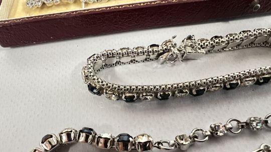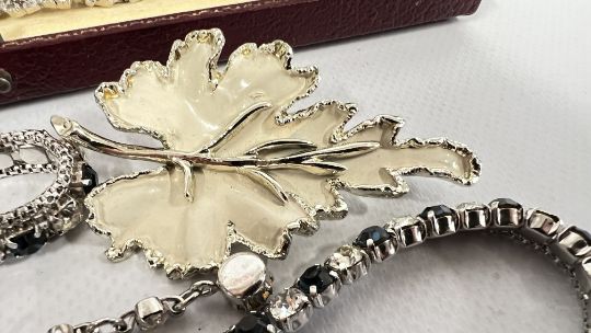 A SMALL GROUP OF VINTAGE COSTUME AND DRESS JEWELLERY TO INCLUDE NECKLACE AND BRACELET SET, LEAF BROOCH, FLOWER BRACELET, CLIP ON EARRINGS, ETC.