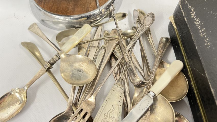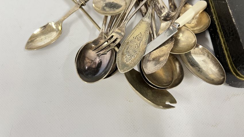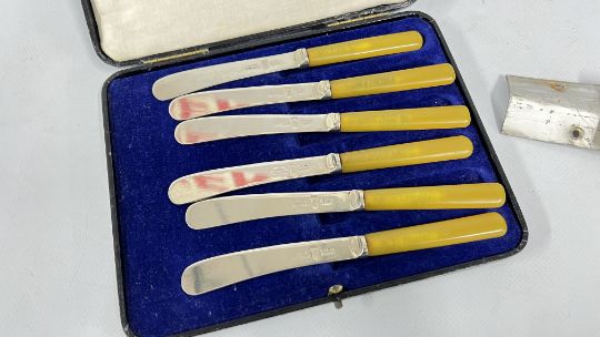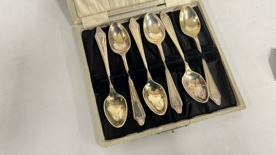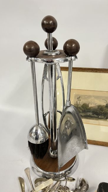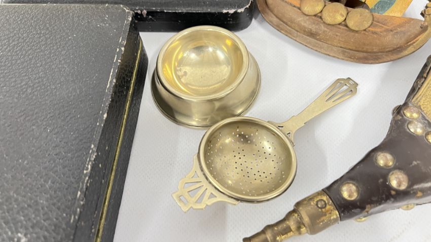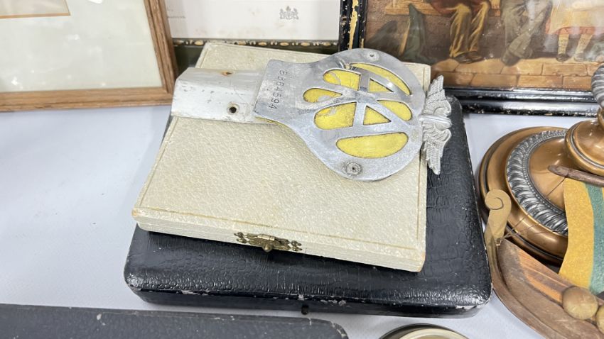 A BOX OF COLLECTIBLES TO INCLUDE BOXED CUTLERY, PAIR OF CANDLESTICKS, BRASS BELLOWS, FLAT WARE, FRAMED AND MOUNTED ETCHING "KIMBERLEY HALL" + "THE VILLAGE SCHOOL" PRINT + A MID CENTURY COMPANION SET AND A VINTAGE AA BADGE 8B64594.