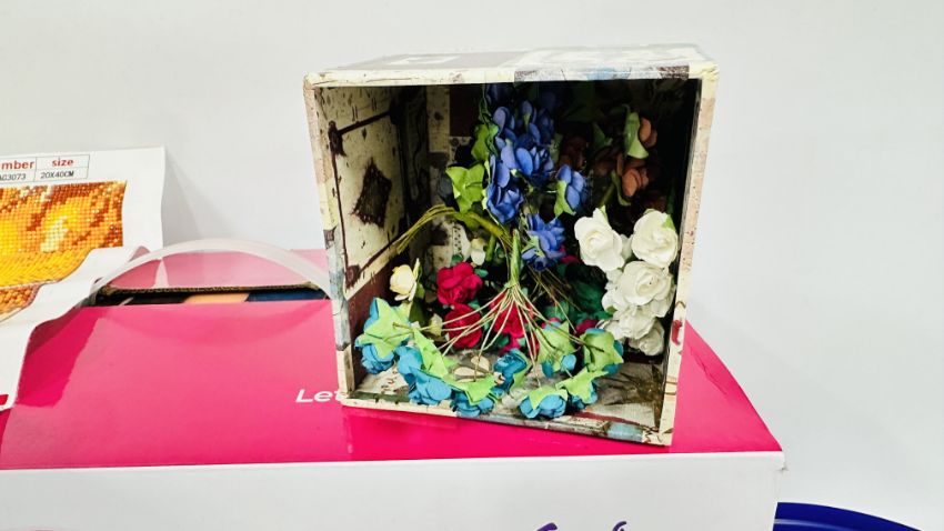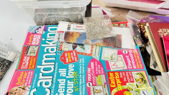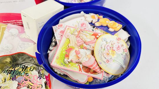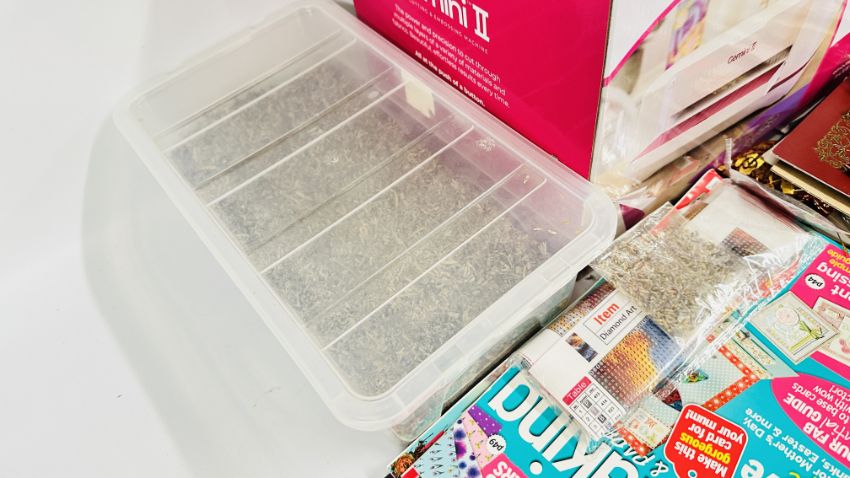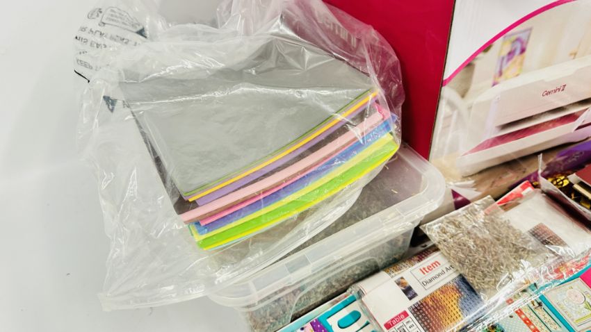 GEMINI II ELECTRIC DIE CUTTING AND EMBOSSING MACHINE WITH 2 BOXES OF CARD & CRAFT RELATED ITEMS - SOLD AS SEEN.