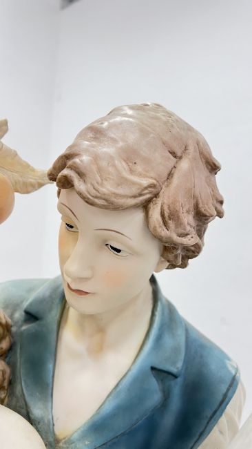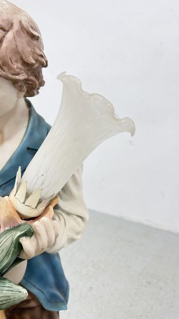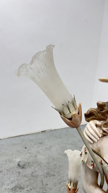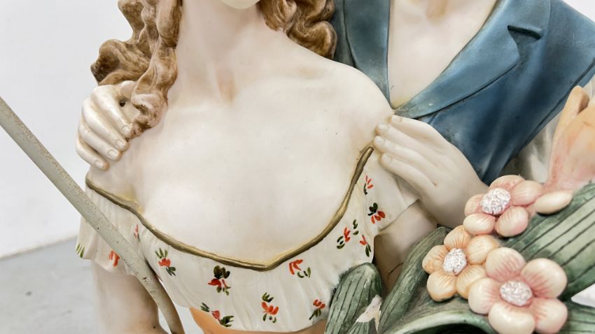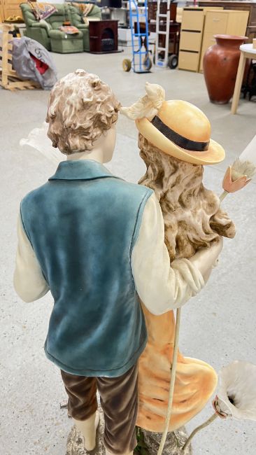 A LARGE COMPOSITE FLOOR STANDING LAMP WITH GLASS SHADE DEPICTING YOUNG LOVERS, H 110CM.