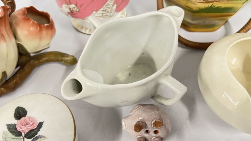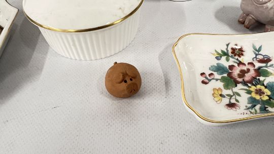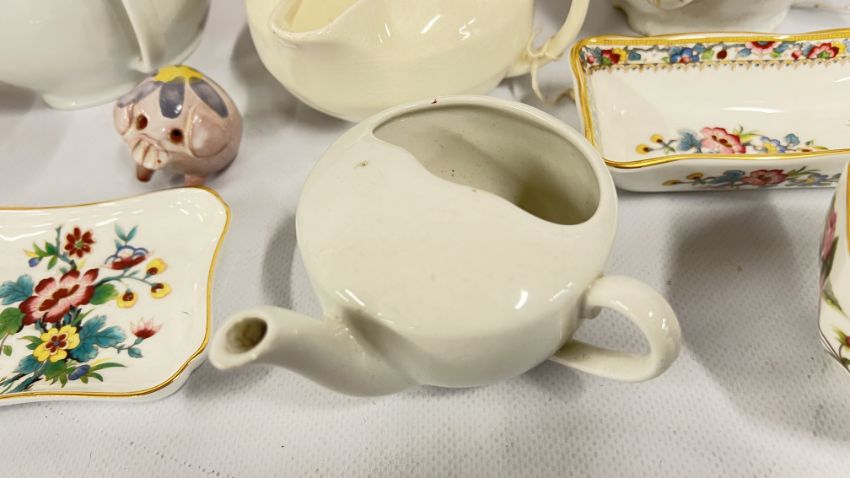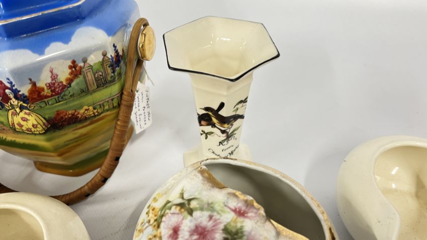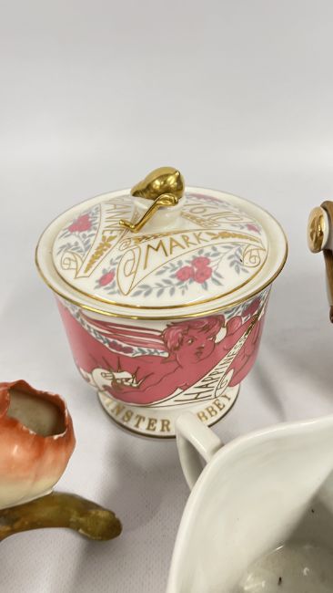 A GROUP OF CHINA AND CERAMICS TO INCLUDE COALPORT MING ROSE, SPODE, BISCUIT BARREL, COALPORT COMMEMORATIVE LIDDED POT, SPILL VASE + SMALL QUANTITY OF GLASSWARE.