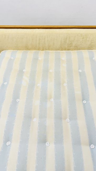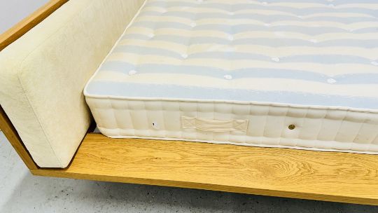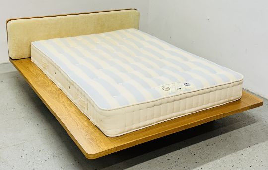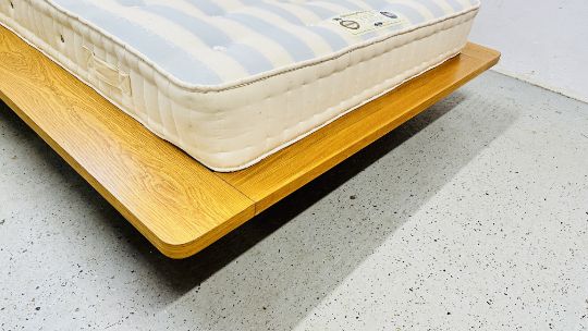 OAK FINISH QUEEN SIZE BED WITH SLEEPEEZEE CONCEPT 1000 BACK CARE MATTRESS, HEADBOARD 167CM WIDE.