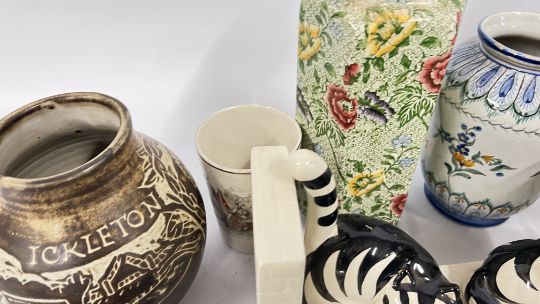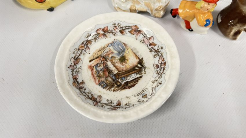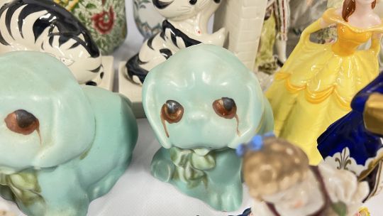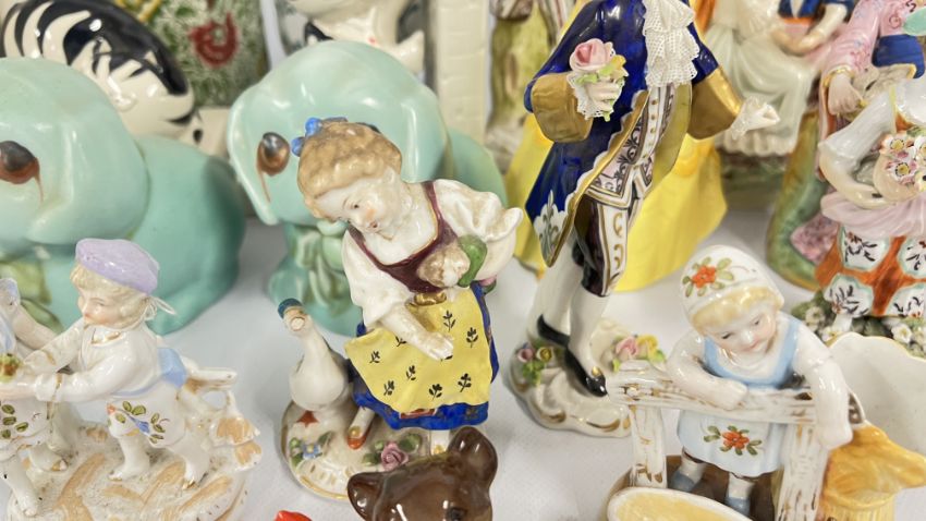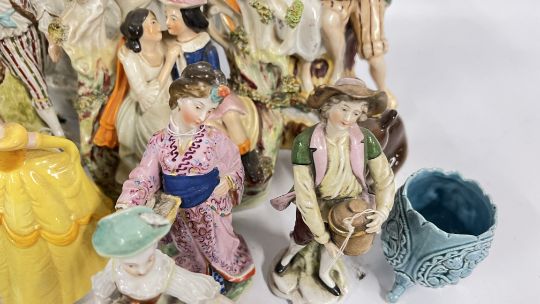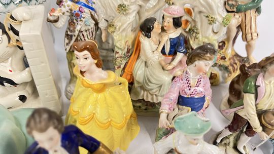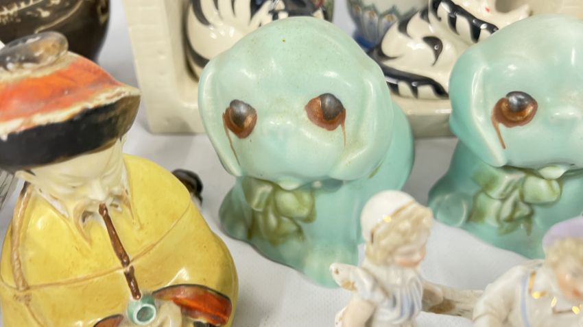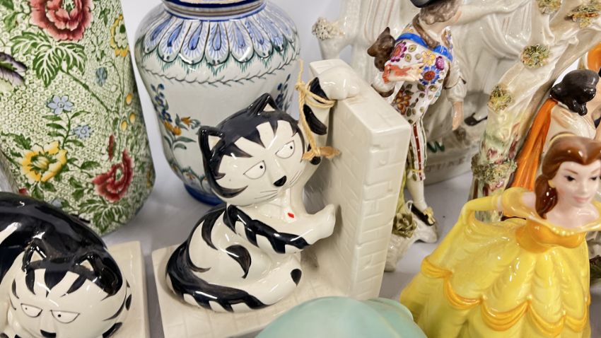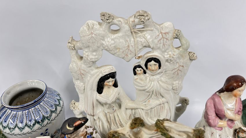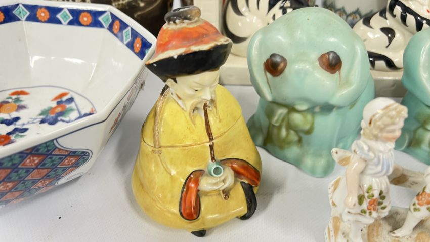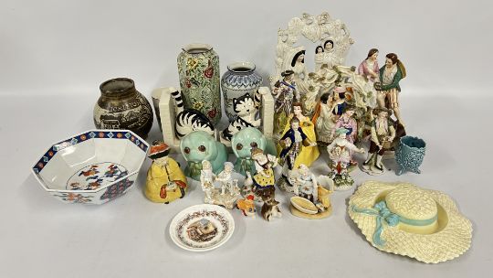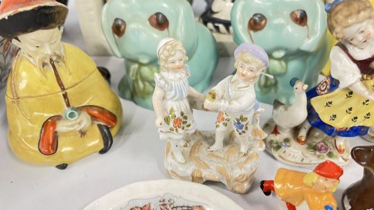 A GROUP OF VINTAGE CONTINENTAL FIGURINES ALONG WITH VARIOUS STAFFORDSHIRE STYLE FLAT BACKS, REQUIRE ATTENTION. ORIENTAL INKWELL + VARIOUS SUNDRY CHINA, PAIR OF SYLVAC STYLE PUPPIES, STUDIO POTTERY VASE.