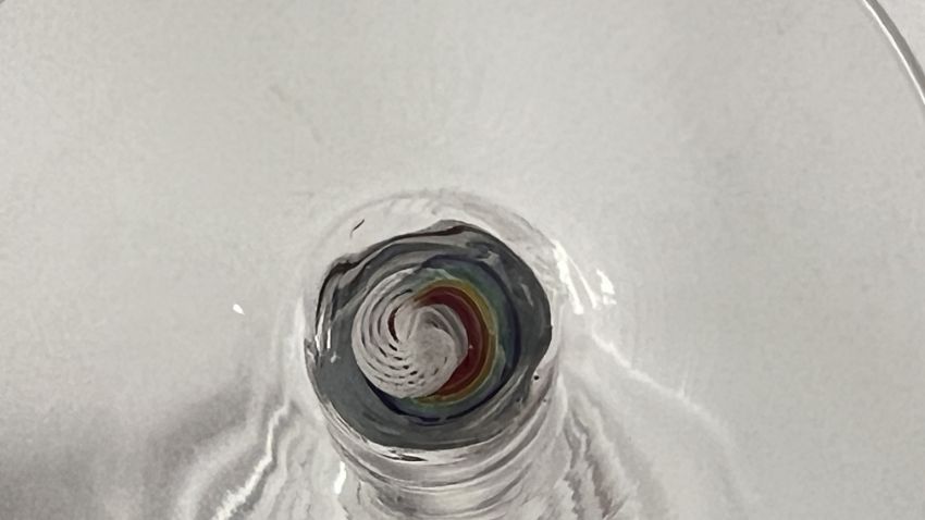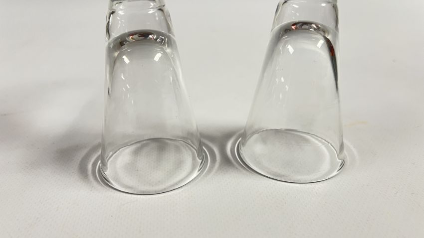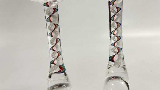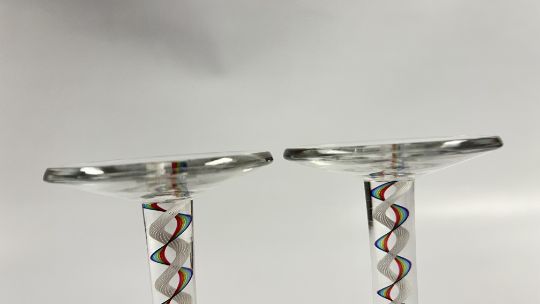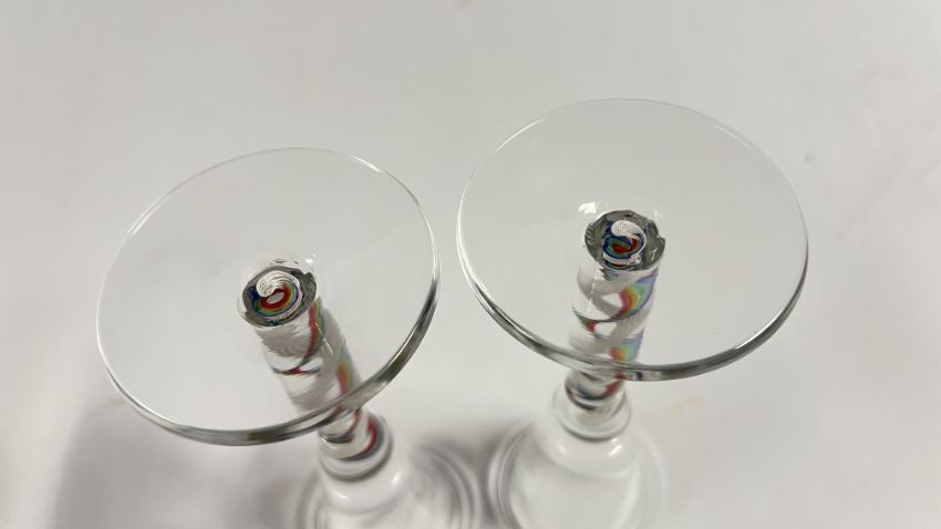 A PAIR OF HAND BLOWN AIR TWIST LIQUEURS, SIGNED TO BASE MIKE..., HEIGHT 18CM.