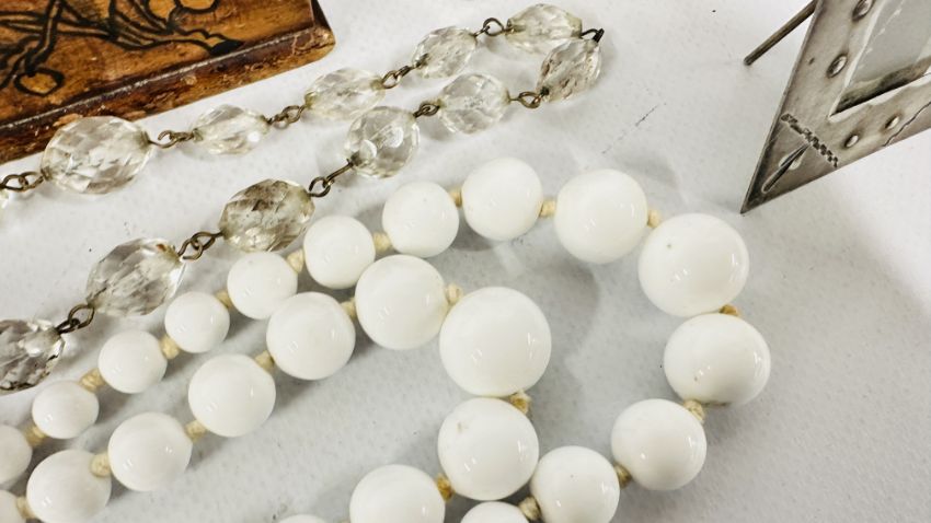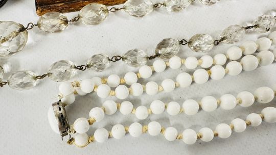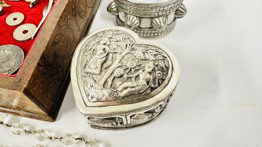 A VINTAGE BOX AND CONTENTS TO INCLUDE HARD STONE AND GLASS BEADED NECKLACES, PERSIAN WHITE METAL CUFF BANGLE, VINTAGE EMBOSSED LEATHER PURSE + AN ELABORATE EMBOSSED INDIAN STYLE TRINKET BOX, ENAMEL TRINKET BOX ETC.