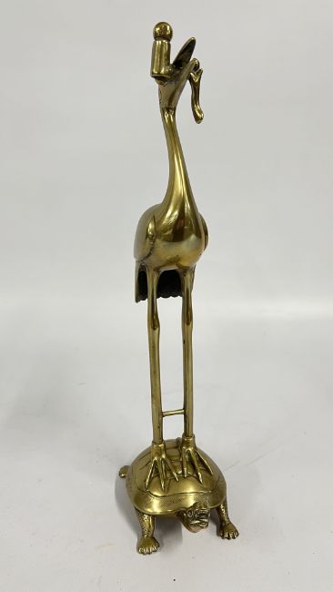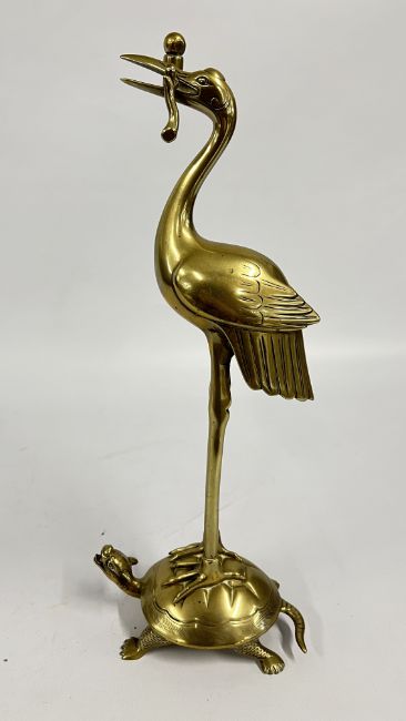 AN IMPRESSIVE SOLID BRASS SCULPTURE OF A CRANE STANDING ON A TORTOISE, H 42CM.