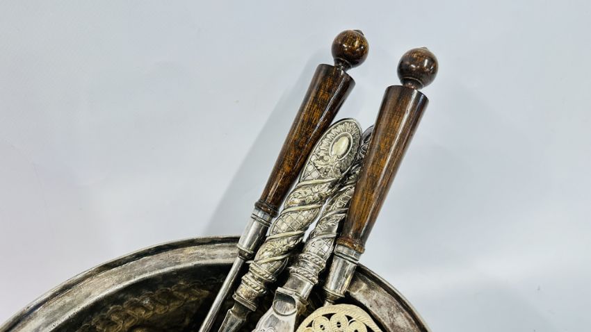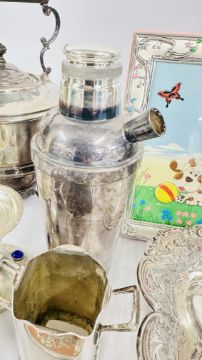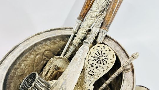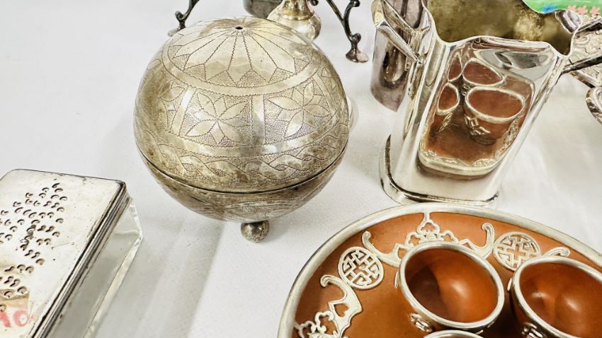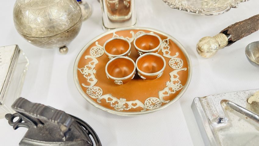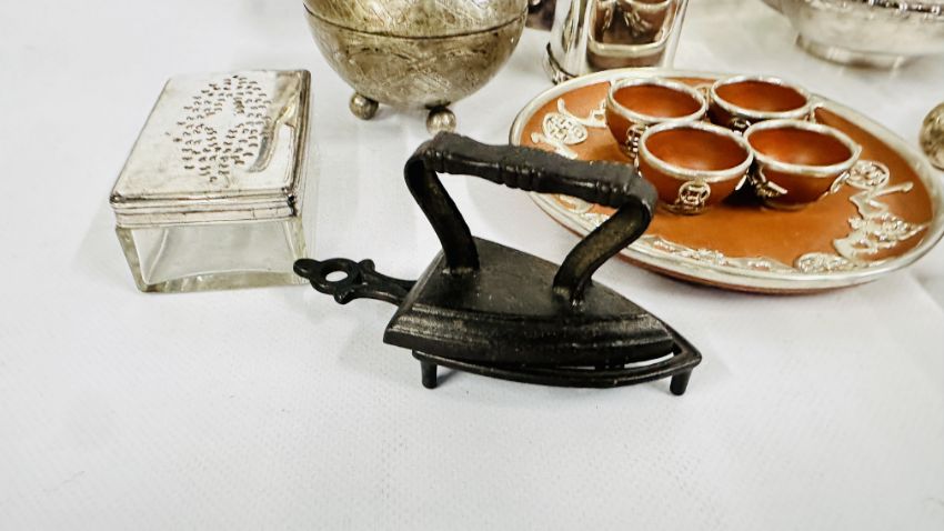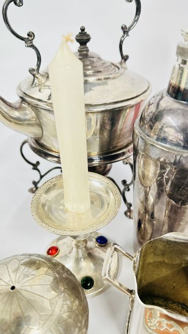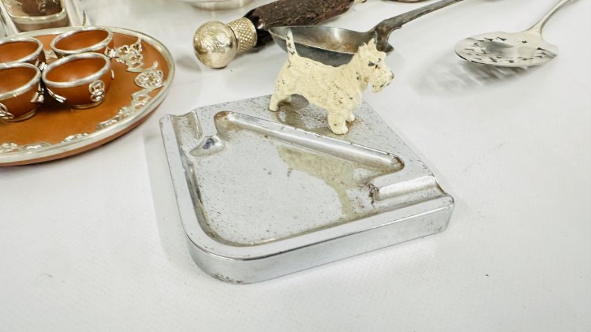 A BOX OF PLATED WARE AND COLLECTIBLES TO INCLUDE COCKTAIL SHAKER, KETTLE & STAND, AN EMBOSSED PERSIAN STYLE PLATED, SALAD SERVERS AND FLATWARE, CHROME COLD PAINTED SCOTTIE DOG ASHTRAY + A WHITE METAL BASTING SPOON, CELTIC STYLE CANDLE STICK + A VINTAGE CHINESE STYLE MINIATURE SET WITH OVERLAY DESIGN + A DECORATIVE OPEN PIECE WORK WHITE METAL BON BON DISH ETC.