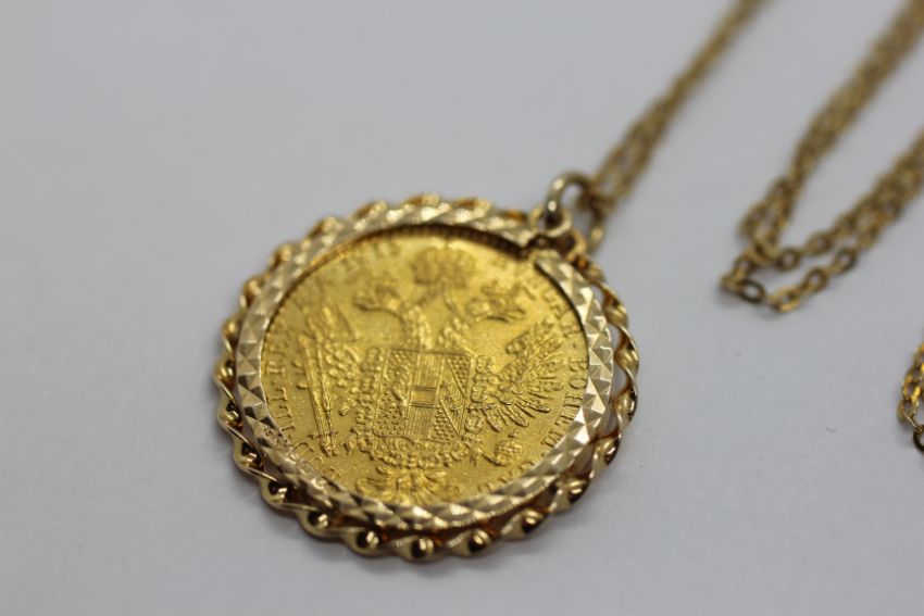 AUSTRIAN ONE DUCAT GOLD COIN (1915 RESTRIKE) ENCAPSULATED IN 9CT GOLD PENDANT MOUNT STRUNG FROM A 14CT GOLD NECKLACE.