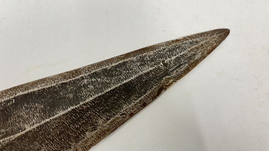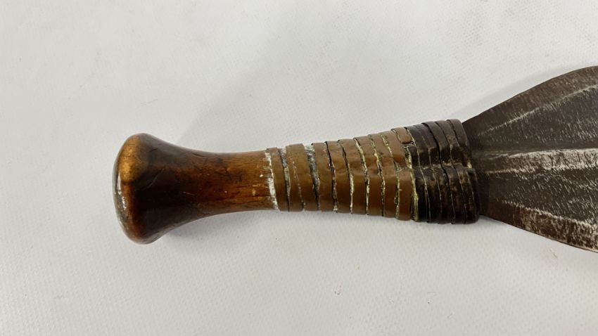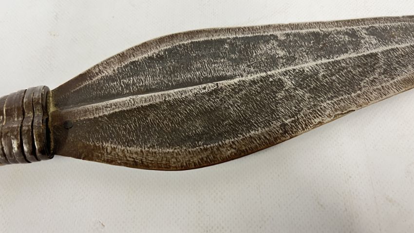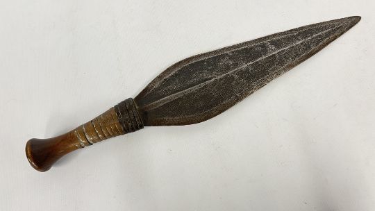 ANTIQUE TRIBAL DAGGER 48CM HARDWOOD COPPER BANDED HANDLE.