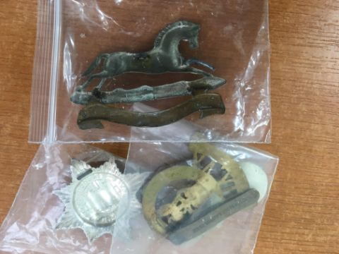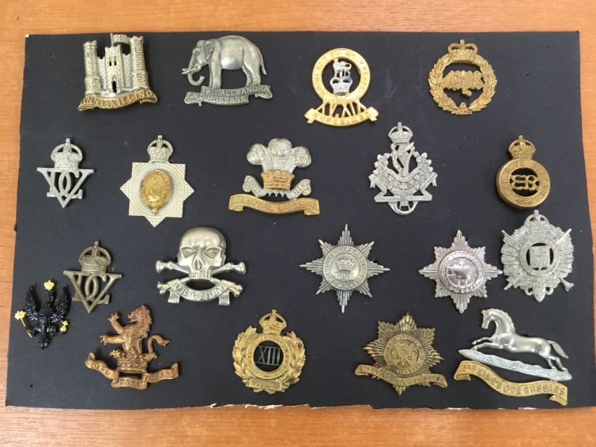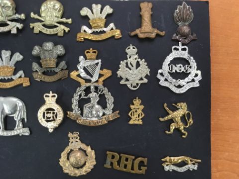 MILITARIA: A COLLECTION OF CAP BADGES MOUNTED ON THREE CARDS, MIX OF ORIGINAL, RESTRIKES, STAYBRITE ETC., SOME WITH MAKERS INSCRIPTIONS ON SLIDE, A FEW OTHER ITEMS (APPROX 59 ITEMS).