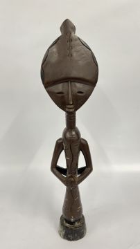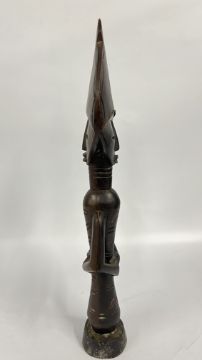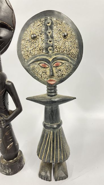 THREE CARVED ETHNIC TRIBAL STATUE SCULPTURES, ONE HAVING BEADED INLAID DETAIL, TALLEST 61CM.